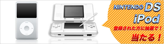 | 新規にオンライン登録していただき、その後、当社にて面談・本登録が完了した方の中から、『NINTENDO DS』を2名様、『iPod』を1名様に抽選でプレゼントいたします。 |